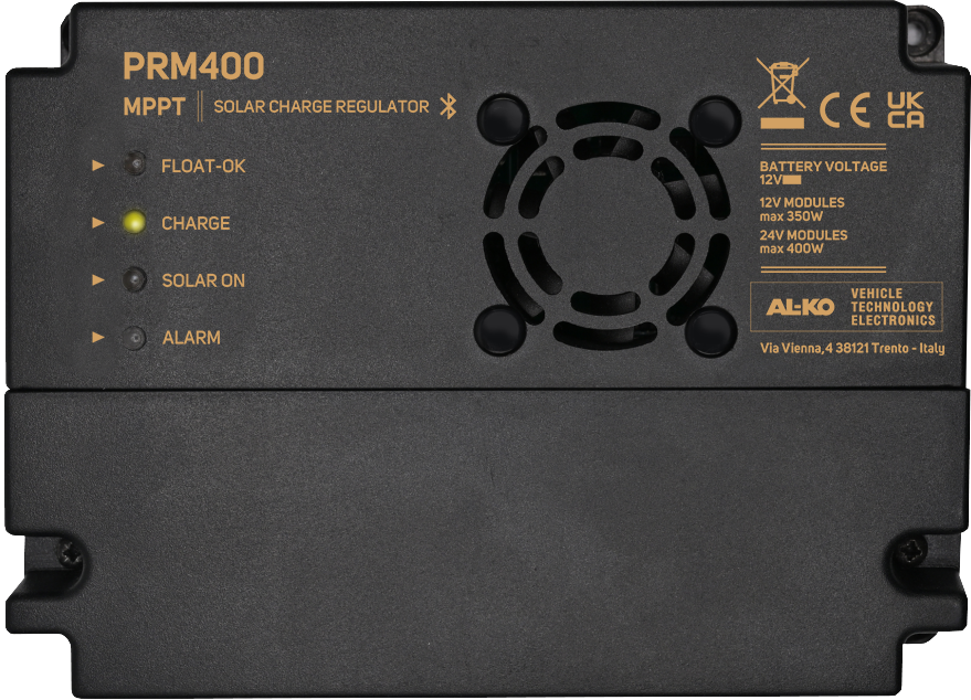 The high-quality PRM400 solar regulator can process the energy from solar panels with up to 400 watts total output as well as charge both lithium-ion and lead-acid batteries (such as gel or AGM batteries) with 12 volts. The energy supply is automatically controlled and limited. Thanks to MPPT technology, the PRM400 ensures that the maximum possible power is always extracted from the solar panels, which makes charging the batteries particularly efficient.